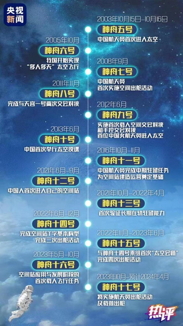 飛天20載,所向皆星河。從神五到神十七,從首次太空飛行到長期駐守空間站,20年間,我國載人航天事業(yè)實(shí)現(xiàn)跨越式發(fā)展,載人航天工程發(fā)射任務(wù)實(shí)現(xiàn)30戰(zhàn)30捷。有太多高光時刻值得銘記,每一步都夯實(shí)基礎(chǔ),每一步都標(biāo)定未來。