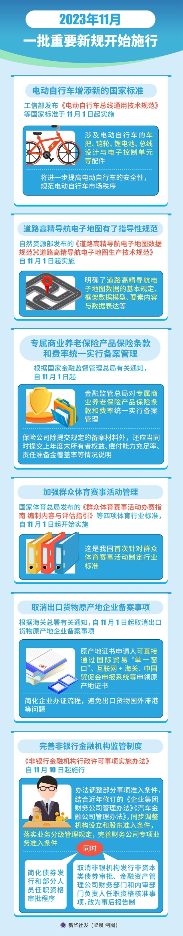 電動自行車增添新國標(biāo),為用戶提供更多安全保障;道路高精導(dǎo)航電子地圖有了指導(dǎo)性規(guī)范,讓自駕出行更加高效便捷;完善專屬商業(yè)養(yǎng)老保險產(chǎn)品管理制度,守好居民“養(yǎng)老錢”……一批重要新規(guī)11月開始施行。一起看看,哪條你最關(guān)心?
