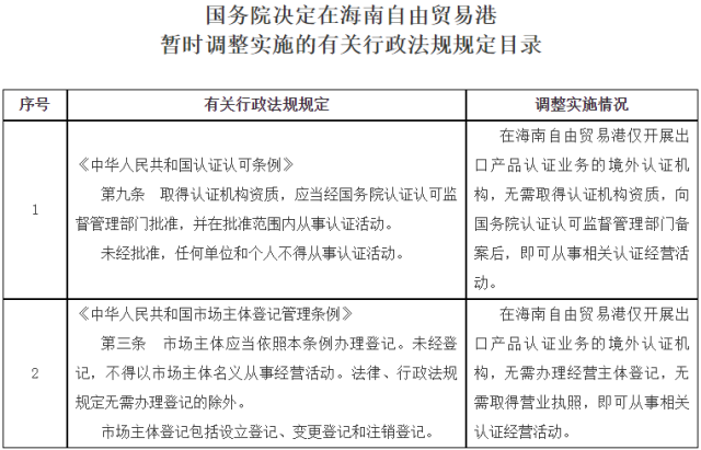 一、為支持海南自由貿(mào)易港建設(shè),按照《海南自由貿(mào)易港建設(shè)總體方案》,同意自即日起在海南自由貿(mào)易港暫時(shí)調(diào)整實(shí)施《中華人民共和國認(rèn)證認(rèn)可條例》《中華人民共和國市場主體登記管理?xiàng)l例》有關(guān)規(guī)定(目錄附后),在海南自由貿(mào)易港僅開展出口產(chǎn)品認(rèn)證業(yè)務(wù)的境外認(rèn)證機(jī)構(gòu),無需取得認(rèn)證機(jī)構(gòu)資質(zhì)和辦理經(jīng)營主體登記,向國務(wù)院認(rèn)證認(rèn)可監(jiān)督管理部門備案后,即可開展出口產(chǎn)品認(rèn)證業(yè)務(wù),認(rèn)證結(jié)果僅限出口企業(yè)境外使用。備案條件和程序由國務(wù)院認(rèn)證認(rèn)可監(jiān)督管理部門制定。