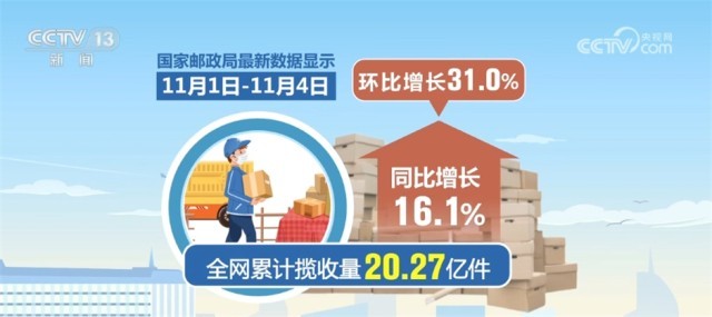國(guó)家郵政局今天(11月5日)發(fā)布,快遞業(yè)從11月開始迎來(lái)業(yè)務(wù)旺季。最新數(shù)據(jù)顯示,11月1日至11月4日,全網(wǎng)累計(jì)攬收量20.27億件,同比增長(zhǎng)16.1%,環(huán)比增長(zhǎng)31.0%。今年快遞業(yè)務(wù)旺季從11月1日開始,到2024年春節(jié)前夕結(jié)束,時(shí)長(zhǎng)102天。