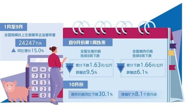 自9月份第1周以來,全國(guó)生豬價(jià)格連續(xù)8周下跌,累計(jì)下跌1.63元/公斤,跌幅達(dá)9.5%;全國(guó)豬肉價(jià)格連續(xù)8周下跌,累計(jì)下跌1.66元/公斤,跌幅達(dá)6.1%。10月份第4周,全國(guó)豬肉平均價(jià)格25.60元/公斤,比前一周下跌1.2%,同比下跌38.5%。