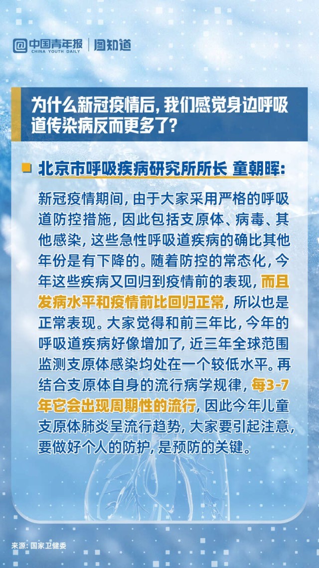 肺炎支原體感染和普通流感有什么區(qū)別?今年肺炎支原體感染有何特點?為什么新冠疫情后,我們感覺身邊呼吸道傳染病反而更多了?目前我國新冠形勢究竟如何?時值冬季,新冠病毒是否會出現(xiàn)再次變異?多重病毒疊加混合感染后如何治療?今天下午,國家衛(wèi)健委就冬季呼吸道疾病防治有關(guān)情況回答了熱點提問。