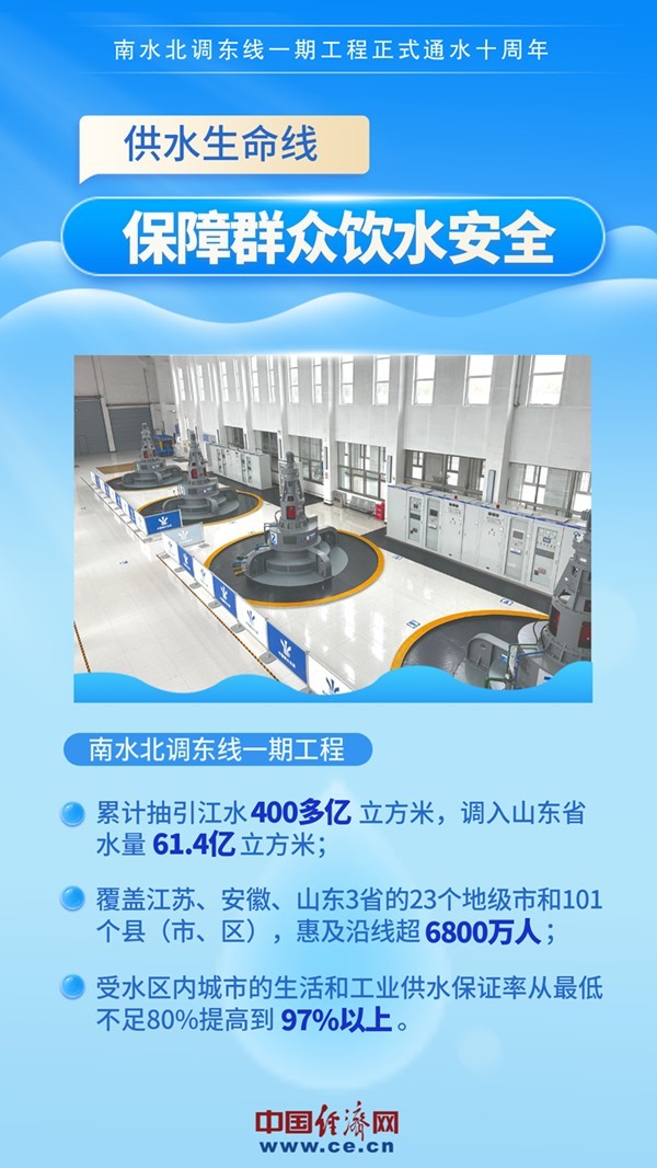 10年來(lái),長(zhǎng)江水、淮河水、黃河水等水系構(gòu)筑起的縱橫水網(wǎng),由一渠清水串連,鋪陳在東方大地上,連接起江蘇、安徽、山東3省的23個(gè)地級(jí)市和其轄內(nèi)的101個(gè)縣(市、區(qū))用水需求,惠及沿線超6800萬(wàn)人。