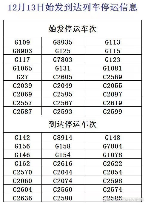 據(jù)北京西站官方微博今天中午最新消息,受降雪影響,12月13日,北京西站G57、G807、G97次列車臨時停運(yùn),北京豐臺站G63、G629次列車臨時停運(yùn)。今天早上,北京西站、北京豐臺站已發(fā)布部分停運(yùn)列車信息。已購買停運(yùn)列車車票的旅客,可于30日內(nèi)辦理全額退票手續(xù)。請廣大旅客合理安排出行,關(guān)注車站公告或12306網(wǎng)站信息。