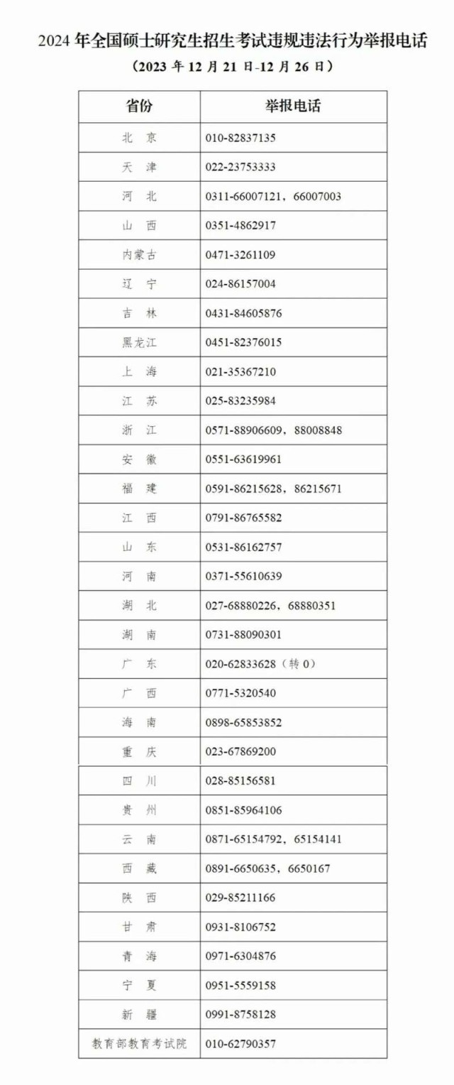 教育部和各?。▍^(qū)、市)教育招生考試機(jī)構(gòu)將開通2024年研考舉報(bào)電話,考生及社會(huì)各界人士可及時(shí)舉報(bào)反映有關(guān)問題線索。教育部及各?。▍^(qū)、市)將會(huì)同有關(guān)部門根據(jù)舉報(bào)線索第一時(shí)間核查處理,堅(jiān)決維護(hù)風(fēng)清氣正的研考環(huán)境。
