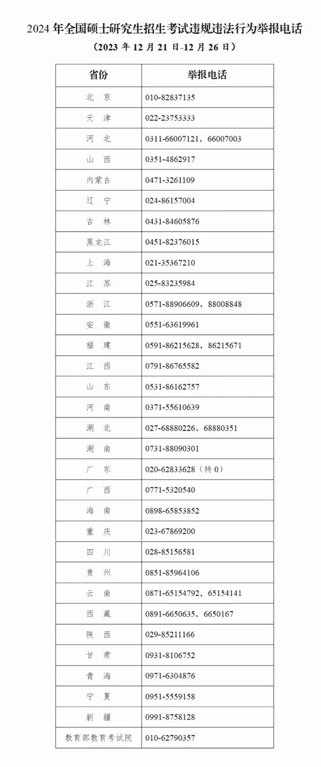教育部和各?。▍^(qū)、市)教育招生考試機(jī)構(gòu)將開通2024年研考舉報電話,歡迎廣大考生及社會各界人士及時舉報反映有關(guān)問題線索。教育部及各?。▍^(qū)、市)將會同有關(guān)部門根據(jù)舉報線索第一時間核查處理,堅(jiān)決維護(hù)風(fēng)清氣正的研考環(huán)境。