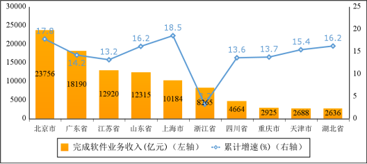 主要軟件大省收入占比持續(xù)提升。1—11月份,軟件業(yè)務(wù)收入居前5名的省份中,北京市,廣東省,江蘇省,山東省,上海市軟件收入分別為23756億元、18190億元、12920億元、12315億元和10184億元,分別增長17.8%、14.2%、13.2%、16.2%和18.5%,五省(市)合計軟件業(yè)務(wù)收入77365億元,占全國比重為70%,占比較去年同期提高1.2個百分點。
