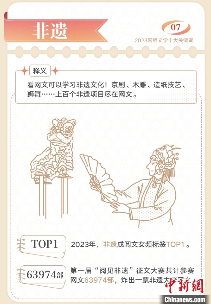 與此同時,網(wǎng)絡(luò)文學(xué)在高質(zhì)量傳承傳統(tǒng)文化方面持續(xù)發(fā)力。京劇、木雕、造紙、獅舞……上百個非遺項(xiàng)目在網(wǎng)文中掀起“傳統(tǒng)文化熱”,“非遺”躍升為閱文女頻標(biāo)簽TOP1。