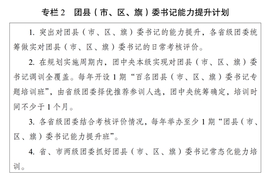 ?。ǘ┩怀觥瓣P(guān)鍵少數(shù)”政治訓(xùn)練。堅持把政治訓(xùn)練貫穿團(tuán)干部成長全周期,使團(tuán)干部的政治素養(yǎng)、政治能力與擔(dān)負(fù)的領(lǐng)導(dǎo)職責(zé)相匹配。強(qiáng)化“一把手”政治培訓(xùn),有計劃地選調(diào)團(tuán)的各級領(lǐng)導(dǎo)機(jī)關(guān)主要負(fù)責(zé)同志到團(tuán)干部教育培訓(xùn)機(jī)構(gòu)參加專題培訓(xùn)。強(qiáng)化對團(tuán)縣(市、區(qū)、旗)委書記這一群體的培訓(xùn),實(shí)施團(tuán)縣(市、區(qū)、旗)委書記能力提升計劃(專欄2)。突出對團(tuán)的領(lǐng)導(dǎo)機(jī)關(guān)干部的政治訓(xùn)練,各級團(tuán)的領(lǐng)導(dǎo)機(jī)關(guān)加強(qiáng)對機(jī)關(guān)干部的常態(tài)化政治能力培訓(xùn)。加強(qiáng)對青年人才的政治引領(lǐng),團(tuán)中央組織部會同有關(guān)單位每年組織一定數(shù)量青年人才開展國情研修。積極推動將地方團(tuán)的領(lǐng)導(dǎo)機(jī)關(guān)班子成員培訓(xùn)納入地方黨委組織開展的干部政治理論培訓(xùn)范疇。