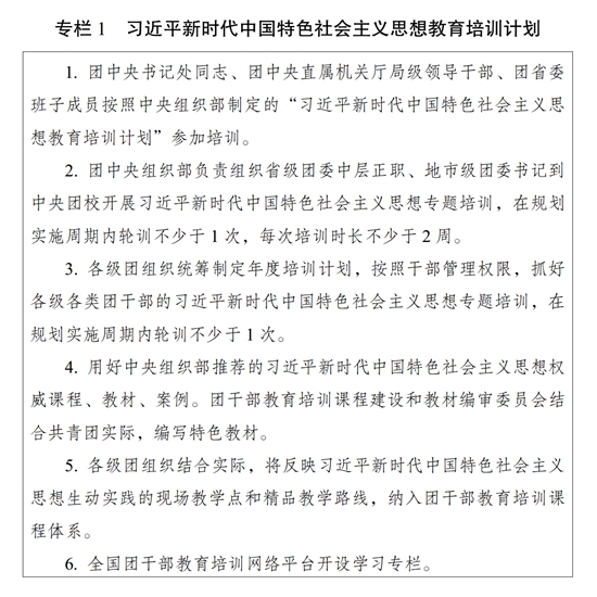 ?。ㄒ唬┚劢咕哿Γ镁脼楣?。完善團(tuán)干部理論教育培訓(xùn)長效機(jī)制,落實(shí)黨的創(chuàng)新理論學(xué)習(xí)教育計劃,組織實(shí)施習(xí)近平新時代中國特色社會主義思想教育培訓(xùn)計劃(專欄1),系統(tǒng)謀劃、持續(xù)用力,不斷把思想鑄魂、理論武裝工作引向深入。堅持把習(xí)近平新時代中國特色社會主義思想作為團(tuán)的各級領(lǐng)導(dǎo)機(jī)關(guān)班子成員理論學(xué)習(xí)中心組學(xué)習(xí)首要內(nèi)容,作出具體安排、精心組織實(shí)施;作為各級團(tuán)干部教育培訓(xùn)機(jī)構(gòu)的主課必修課,辦好理論進(jìn)修班、理論研修班;作為團(tuán)干部學(xué)習(xí)的中心內(nèi)容,全面系統(tǒng)學(xué)、持續(xù)深入學(xué)、聯(lián)系實(shí)際學(xué)。以縣處級及以上團(tuán)干部為重點(diǎn),開展習(xí)近平新時代中國特色社會主義思想和黨的二十大精神集中輪訓(xùn);深入開展主題教育,通過專題學(xué)習(xí)、研討交流、主題黨課、調(diào)查研究、建章立制等形式,推動黨的創(chuàng)新理論學(xué)習(xí)教育走深走實(shí)走心,使廣大團(tuán)干部更加深刻領(lǐng)悟“兩個確立”的決定性意義,更加自覺增強(qiáng)“四個意識”、堅定“四個自信”、做到“兩個維護(hù)”。深入開展習(xí)近平總書記關(guān)于青年工作的重要思想學(xué)習(xí)培訓(xùn),使廣大團(tuán)干部學(xué)習(xí)掌握黨的青年工作的地位作用、目標(biāo)任務(wù)、職責(zé)使命、實(shí)踐要求,為做好新時代新征程黨的青年工作打牢思想基礎(chǔ)。