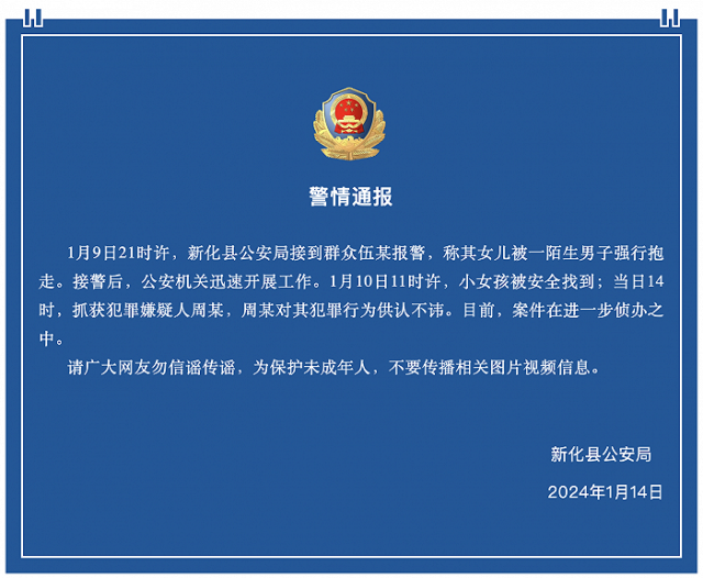 央視網(wǎng)消息:據(jù)“新化公安”公眾號消息,湖南新化縣公安局1月14日晚發(fā)布警情通報(bào),1月9日21時(shí)許,新化縣公安局接到群眾伍某報(bào)警,稱其女兒被一陌生男子強(qiáng)行抱走。接警后,公安機(jī)關(guān)迅速開展工作。1月10日11時(shí)許,小女孩被安全找到;當(dāng)日14時(shí),抓獲犯罪嫌疑人周某,周某對其犯罪行為供認(rèn)不諱。目前,案件在進(jìn)一步偵辦之中。