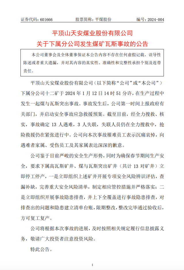 央視網(wǎng)消息:1月14日,平煤股份發(fā)布公告,下屬分公司十二礦于2024年1月12日14時51分許,在生產(chǎn)過程中發(fā)生一起煤與瓦斯突出事故。事故發(fā)生后,公司第一時間上報政府有關部門,并啟動安全事故應急救援預案。截至目前,經(jīng)全力搜救、核實,事故確定13人遇難,3人失聯(lián),失聯(lián)人員仍在全力搜救中,搶險救援仍在緊張進行中。公司向本次事故罹難員工表示沉痛哀悼,向遇難者家屬、受傷員工及其家屬表達深深的歉意。