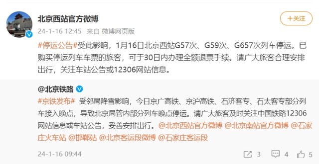 受降雪影響,1月16日北京西站G57次、G59次、G657次列車停運(yùn)
