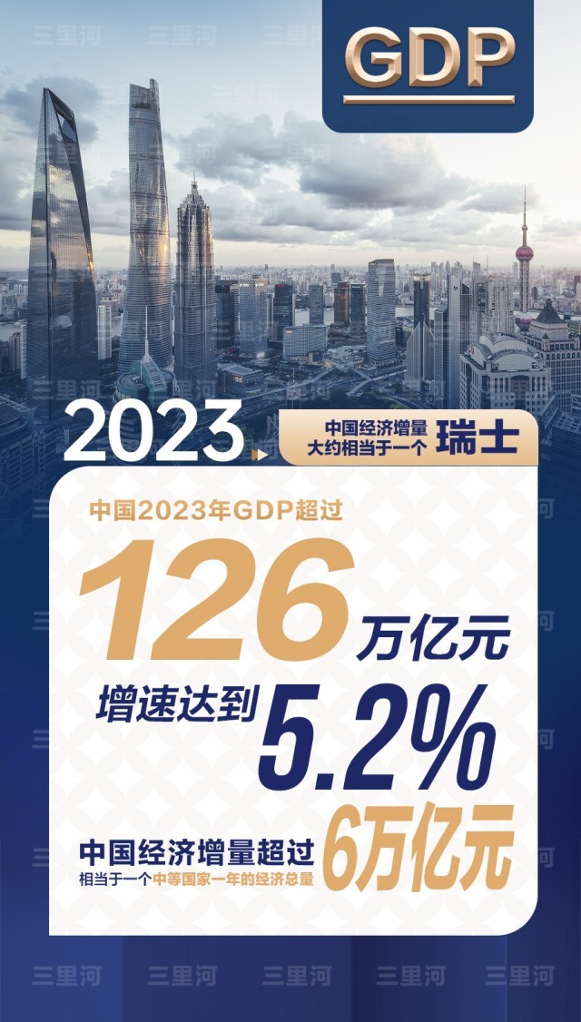 2023年中國經(jīng)濟(jì)年報顯示,全年GDP超過126萬億元(人民幣,下同),增速達(dá)到5.2%。按照可比價計算,2023年中國經(jīng)濟(jì)增量超過6萬億元,相當(dāng)于一個中等國家一年的經(jīng)濟(jì)總量。