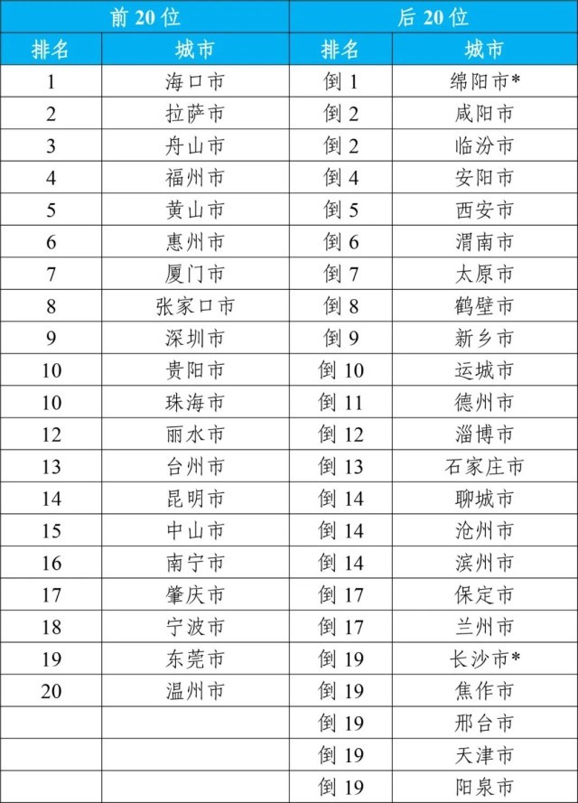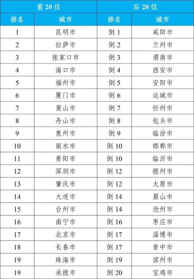 12月,168個(gè)重點(diǎn)城市中:空氣質(zhì)量排名前20位城市依次是昆明、拉薩和張家口等城市(從第1名至并列第19名);空氣質(zhì)量排名后20位城市依次是咸陽(yáng)、蘭州和渭南等城市(從倒數(shù)第1名至倒數(shù)第20名)。見(jiàn)附表1。