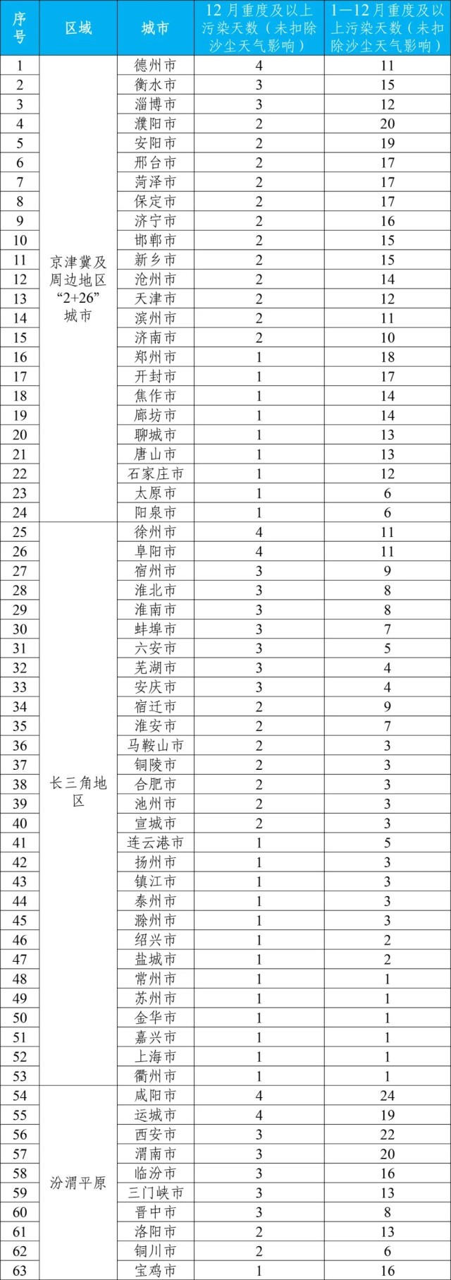 12月和1—12月重點(diǎn)區(qū)域出現(xiàn)重度及以上污染天的城市及具體天數(shù)詳見(jiàn)附表4。