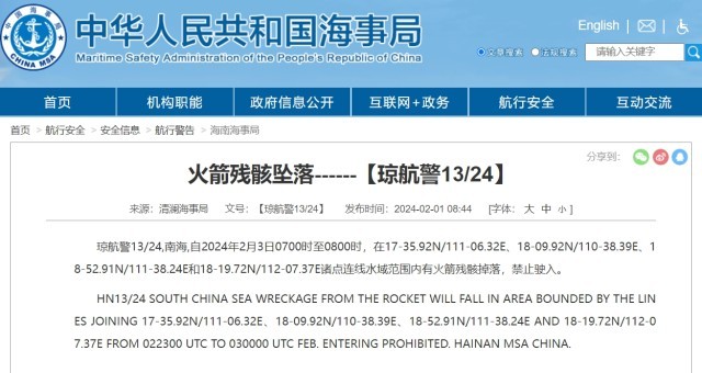 央視網(wǎng)消息:據(jù)中國(guó)海事局網(wǎng)站消息,清瀾海事局發(fā)布航行警告,2月3日7時(shí)至8時(shí),南海部分海域有火箭殘骸掉落,禁止駛?cè)搿?/p>