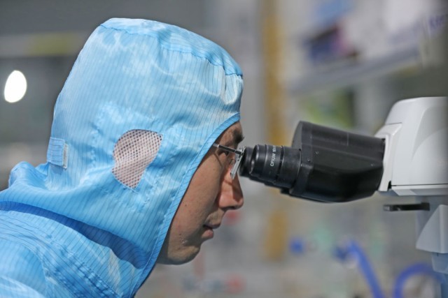 在位于沈陽市的中國科學(xué)院金屬研究所納米碳基電子器件超凈實(shí)驗(yàn)室,孫東明在聚焦光學(xué)顯微鏡前觀測(cè)實(shí)驗(yàn)樣品的形貌(2月24日攝)。