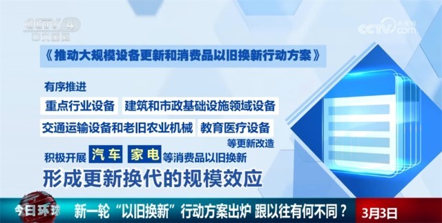 央視網(wǎng)消息:日前,國(guó)務(wù)院常務(wù)會(huì)議審議通過(guò)了《推動(dòng)大規(guī)模設(shè)備更新和消費(fèi)品以舊換新行動(dòng)方案》。行動(dòng)方案有哪些亮點(diǎn)?新一輪“以舊換新”和以往有什么不同?來(lái)看專家的解讀。