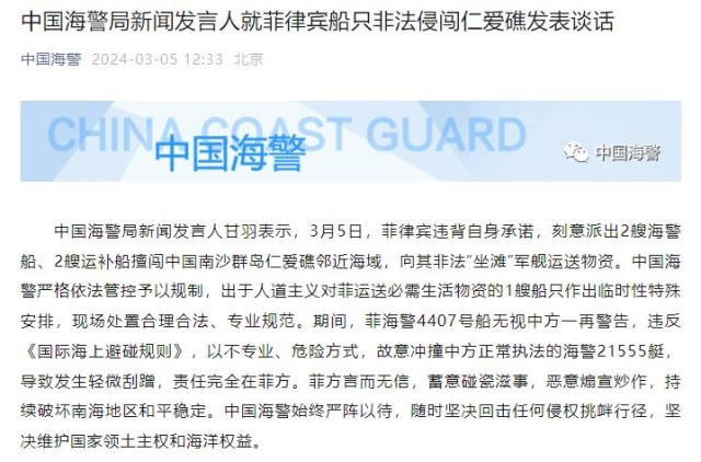 中國(guó)海警局新聞發(fā)言人就菲律賓船只非法侵闖仁愛礁發(fā)表談話