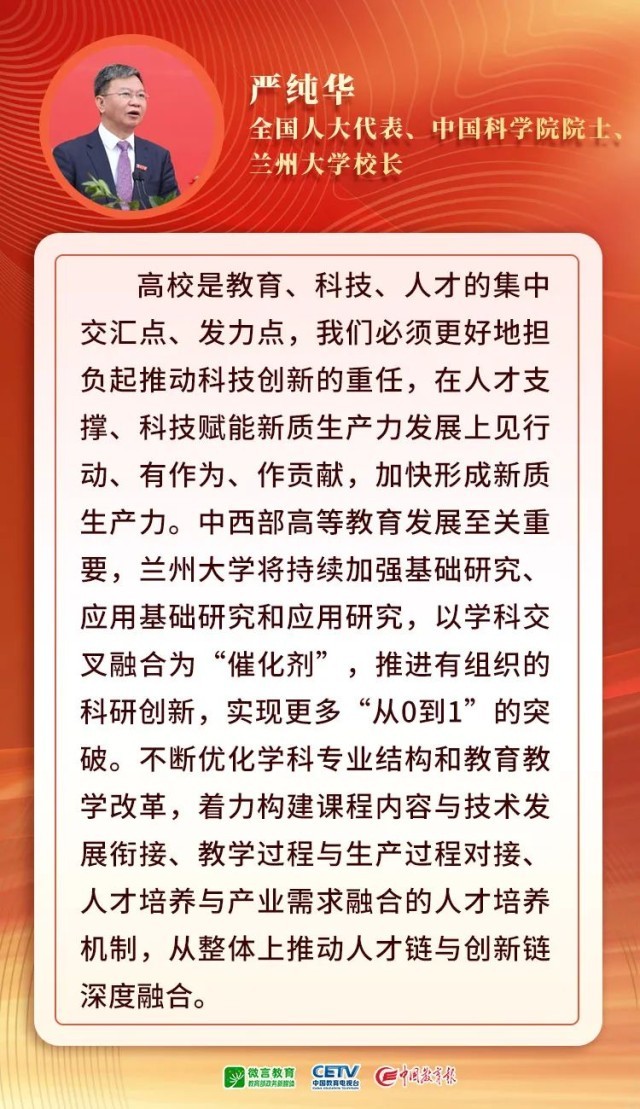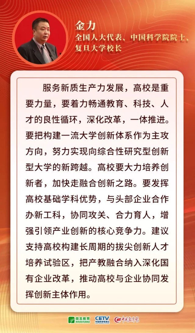 2024年政府工作報(bào)告提出,大力推進(jìn)現(xiàn)代化產(chǎn)業(yè)體系建設(shè),加快發(fā)展新質(zhì)生產(chǎn)力。培育和發(fā)展新質(zhì)生產(chǎn)力,創(chuàng)新是核心要素,基礎(chǔ)和先導(dǎo)靠教育。高校如何發(fā)揮支撐作用,推動(dòng)新質(zhì)生產(chǎn)力發(fā)展?5位代表委員,同時(shí)也是大學(xué)書(shū)記、校長(zhǎng),提出了建議,來(lái)聽(tīng)他們?cè)趺凑f(shuō)——