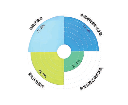 愛(ài)國(guó)主義教育入耳、入腦,更入心。此次調(diào)研中,79.75%的受訪者參與過(guò)紅色旅游,年齡主要集中在18~35歲之間。超過(guò)70%的人選擇參觀博物館和紀(jì)念地(74.68%)、重走歷史路線(70.89%)以及體驗(yàn)式活動(dòng)(77.22%)三種形式,90.87%的受訪者表示,參與紅色旅游的目的是學(xué)習(xí)歷史文化知識(shí)、接受紅色文化洗禮。