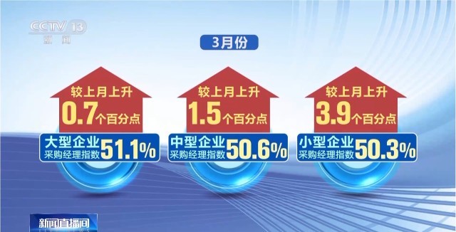 3月份,大中小型企業(yè)采購經(jīng)理指數(shù)分別為 51.1%、50.6%和50.3%,較上月分別上升0.7、1.5和3.9個百分點,不同規(guī)模企業(yè)生產(chǎn)經(jīng)營狀況均有所改善。