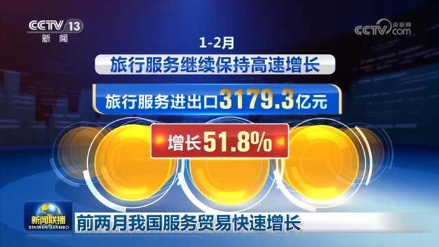 旅行服務增長勢頭迅猛。1—2月,旅行服務繼續(xù)保持高速增長,旅行服務進出口3179.3億元,增長51.8%,成為服務貿易第一大領域。