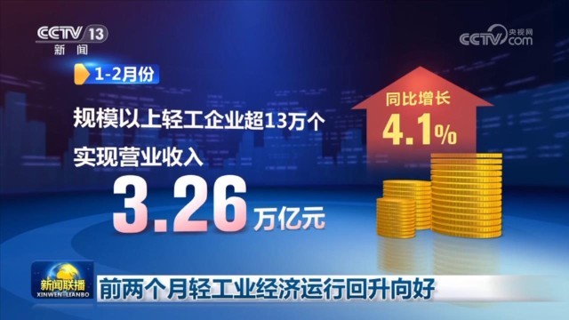 央視網(wǎng)消息(新聞聯(lián)播):中國輕工業(yè)聯(lián)合會發(fā)布數(shù)據(jù)顯示,今年前兩個月,消費品制造業(yè)發(fā)展動力增強,帶動輕工業(yè)經(jīng)濟(jì)運行回升向好。1—2月,規(guī)模以上輕工企業(yè)超13萬個,實現(xiàn)營業(yè)收入3.26萬億元,同比增長4.1%。