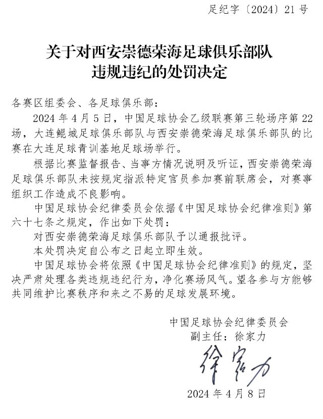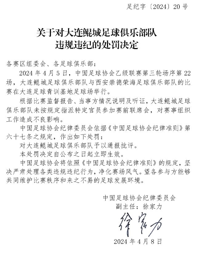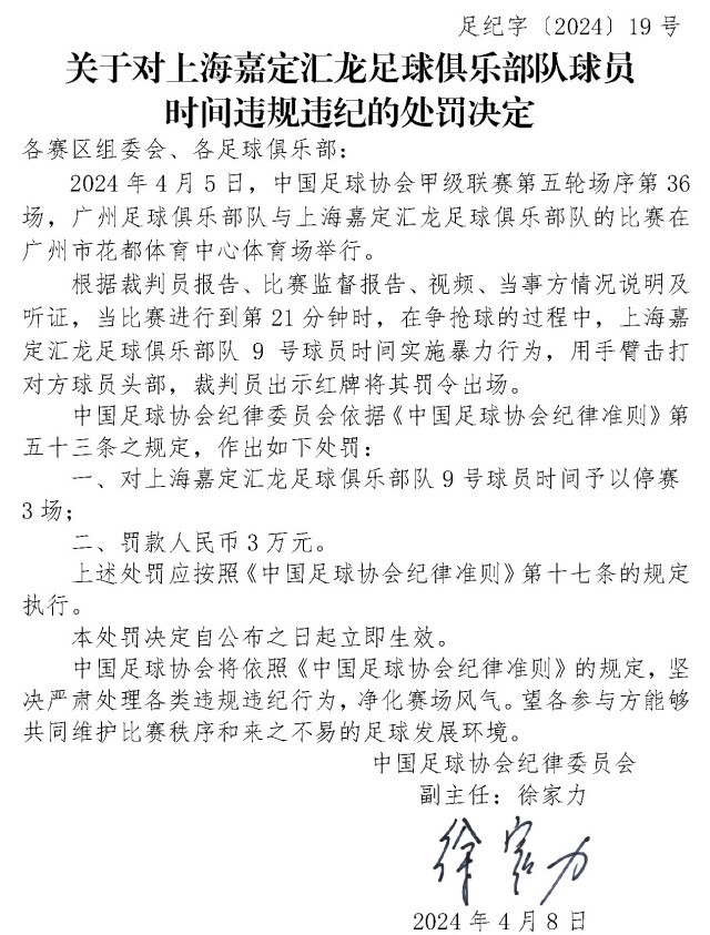 央視網(wǎng)消息:4月10日,中國(guó)足協(xié)網(wǎng)站發(fā)布《關(guān)于對(duì)上海嘉定匯龍足球俱樂部隊(duì)球員時(shí)間違規(guī)違紀(jì)的處罰決定》《關(guān)于對(duì)西安崇德榮海足球俱樂部隊(duì)違規(guī)違紀(jì)的處罰決定》《關(guān)于對(duì)大連鯤城足球俱樂部隊(duì)違規(guī)違紀(jì)的處罰決定》三份處罰決定。中甲聯(lián)賽上海嘉定匯龍9號(hào)球員因暴力行為被停賽罰款。中乙聯(lián)賽大連鯤城與西安崇德榮海兩家俱樂部因未按規(guī)定指派特定官員參加賽前聯(lián)席會(huì),被通報(bào)批評(píng)。