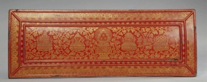 ▲永樂版藏文《大藏經(jīng)》之紅漆戧金八吉祥紋經(jīng)文夾板(圖片來源:故宮博物院官網(wǎng))