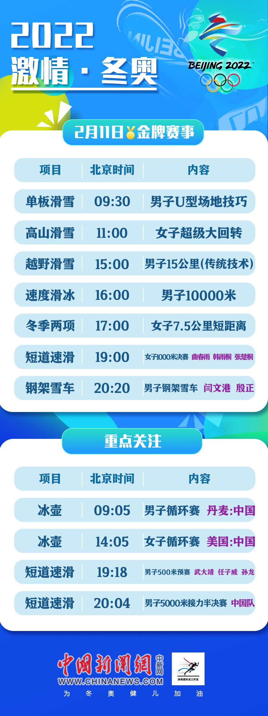 中新網(wǎng)2月10日電 北京冬奧會11日將產(chǎn)生7枚金牌,中國選手閆文港、殷正有望在男子鋼架雪車賽場帶來驚喜。此外,中國短道速滑隊(duì)全面出擊,曲春雨、韓雨桐、張楚桐將在女子1000米項(xiàng)目上力爭佳績,武大靖將開啟男子500米的衛(wèi)冕之旅。