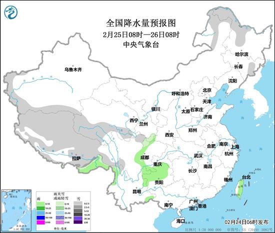 預(yù)計(jì)2月24日14時(shí)至25日14時(shí),新疆南疆西部山區(qū)、西藏北部和西部、青海南部、川西高原東部等地部分道路受小雪或雨夾雪影響;西藏東南部、四川盆地西部、貴州西部、云南東北部等地部分道路受小雨影響;河北中部、浙江西南部、湖北東部和南部、湖南北部、貴州西部和東部、云南東部、四川盆地中部和西部等地部分道路受霧影響能見度低。