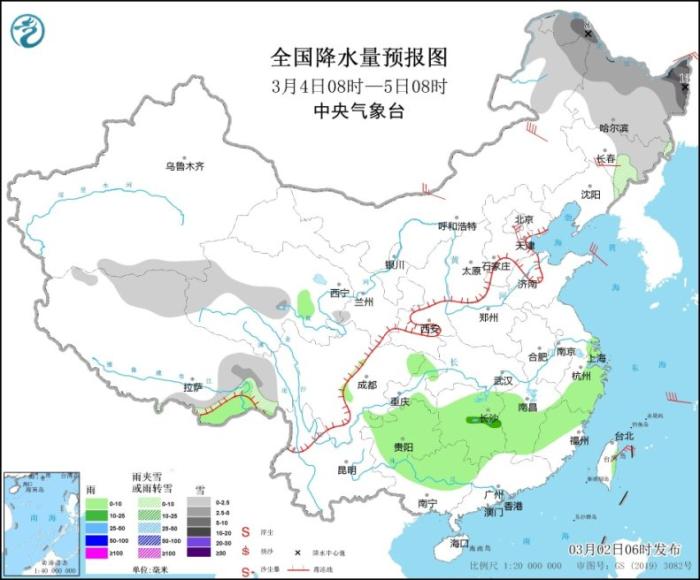 3月4日08時(shí)至5日08時(shí),內(nèi)蒙古東北部、東北地區(qū)中北部、西藏東部、青海西部等地部分地區(qū)有小到中雪,其中,黑龍江東北部等地部分地區(qū)有大到暴雪(10~13毫米)。江南大部、貴州大部、廣西中北部等地部分地區(qū)有小到中雨,其中,湖南中部等地部分地區(qū)有大雨。內(nèi)蒙古中東部、東北地區(qū)中南部、河北北部等地部分地區(qū)有4~6級(jí)風(fēng),其中,內(nèi)蒙古東部部分地區(qū)有6~7級(jí)風(fēng)。