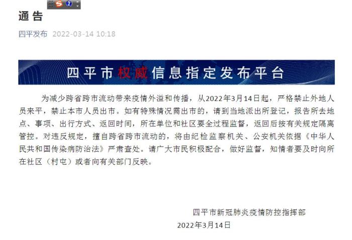 中新網(wǎng)3月14日電 據(jù)“四平發(fā)布”微信公眾號消息,14日,吉林省四平市新冠肺炎疫情防控指揮部發(fā)布通告,為減少跨省跨市流動帶來疫情外溢和傳播,從2022年3月14日起,嚴(yán)格禁止外地人員來平,禁止本市人員出市。如有特殊情況需出市的,請到當(dāng)?shù)嘏沙鏊怯洠瑘蟾嫠サ攸c、事項、出行方式、返回時間,所在單位和社區(qū)要全過程監(jiān)督,返回后按有關(guān)規(guī)定隔離管控。對違反規(guī)定,擅自跨省跨市流動的,將由紀(jì)檢監(jiān)察機關(guān)、公安機關(guān)依據(jù)《中華人民共和國傳染病防治法》嚴(yán)肅查處。請廣大市民積極配合,做好監(jiān)督,知情者要及時向所在社區(qū)(村屯)或者向有關(guān)部門反映。