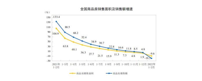 1—2月份,商品房銷售面積15703萬(wàn)平方米,同比下降9.6%,其中,住宅銷售面積下降13.8%;商品房銷售額15459億元,下降19.3%,其中,住宅銷售額下降22.1%。