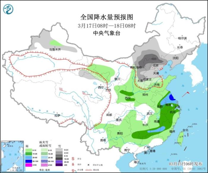 3月17日8時(shí)至18日8時(shí),內(nèi)蒙古中部、東北地區(qū)南部、新疆北部、青海北部、華北大部等地部分地區(qū)有小到中雪或雨夾雪,其中,內(nèi)蒙古中部、河北北部等地部分地區(qū)有大到暴雪(10~11毫米)。陜西中部、江淮大部、江南中東部和南部、廣西東北部等地部分地區(qū)有中到大雨,其中,江蘇中部局地有暴雨。