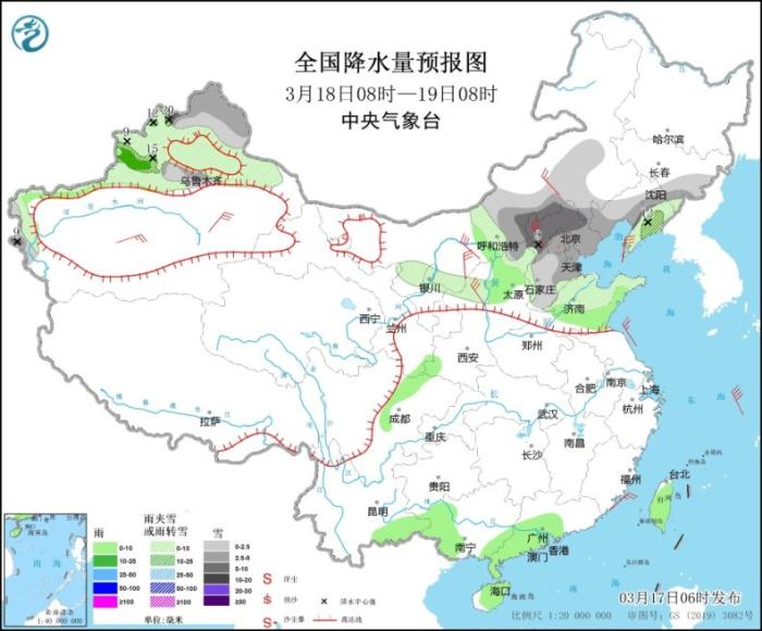 3月18日8時至19日8時,新疆北北疆大部和南疆西部山區(qū)、內(nèi)蒙古中部、陜西北部、山西北部、京津冀大部、山東中北部、遼寧大部、吉林東南部等地部分地區(qū)有小到中雪或雨夾雪,其中,河北北部、內(nèi)蒙古中部偏南地區(qū)、遼寧中部、新疆北疆西北部等地部分地區(qū)有大到暴雪。新疆伊犁河谷、陜西中部、山東南部、四川盆地西北部、云南東南部、廣西西部、廣東西南部、海南島、臺灣島等地部分地區(qū)有小雨,局地中雨。內(nèi)蒙古中西部、新疆南疆盆地、陜西北部等地部分地區(qū)有4~6級風。