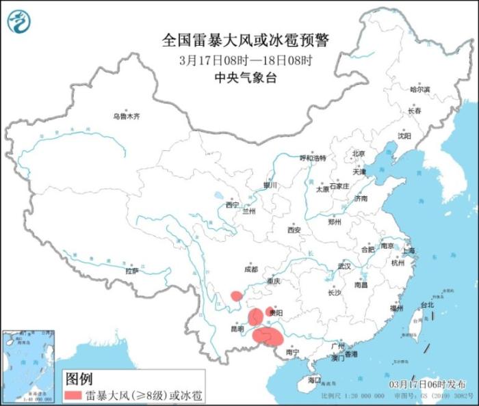 全國雷暴大風或冰雹預(yù)警圖(3月17日8時-18日8時)