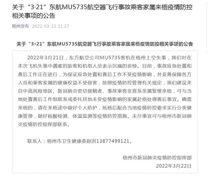 中新網(wǎng)3月22日電 據(jù)“梧州發(fā)布”微信公眾號(hào)消息,3月22日,梧州市新冠肺炎疫情防控指揮部發(fā)布通告稱(chēng),2022年3月21日,東方航空公司MU5735客機(jī)在梧州上空失事。目前,事故應(yīng)急處置和善后工作正在進(jìn)行,為保證應(yīng)急處置和善后工作不受疫情影響,并妥善保障各方人員和乘客家屬的健康權(quán)益不受侵害,按照疫情防控管理有關(guān)規(guī)定,我們建議來(lái)自中高風(fēng)險(xiǎn)地區(qū)、新冠肺炎密切接觸者、事故乘客非直系親屬暫緩來(lái)梧,可與當(dāng)?shù)靥幹蒙坪蠊ぷ鹘M聯(lián)系或委托其他未受疫情影響的家屬赴梧處理善后事宜。