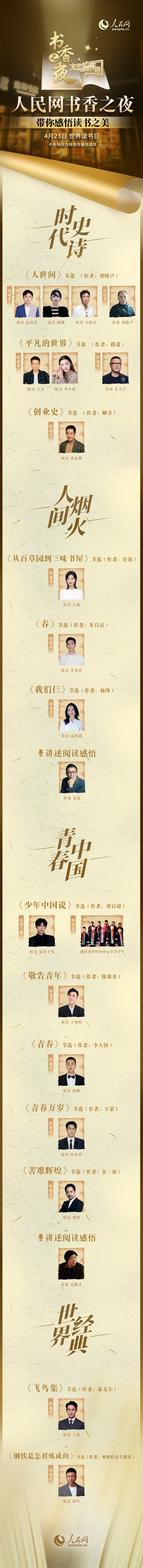 讀書可以讓人保持思想活力,讓人得到智慧啟發(fā),讓人滋養(yǎng)浩然之氣。4月23日是第二十七個世界讀書日,由中央網(wǎng)信辦網(wǎng)絡(luò)傳播局指導(dǎo),人民網(wǎng)“文藝星開講”推出特別策劃——書香之夜,邀請雷佳音、易烊千璽、王凱、秦海璐、萬茜、胡軍、韓東君、王雷、李小萌等文藝工作者,以及作家馮驥才、梁曉聲、麥家一起誦讀文學(xué)經(jīng)典,講述閱讀故事,從書本中感悟讀書之美。4月23日20點,一起讀經(jīng)典!