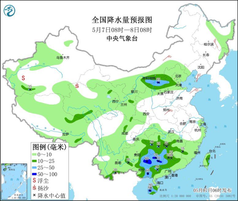 5月7日08時(shí)至8日08時(shí),內(nèi)蒙古河套地區(qū)、陜西北部、山西北部、河北西部、重慶東南部、貴州東部和南部、云南東部和南部、湖南中南部、江西南部、廣西、廣東北部和西部、海南島等地的部分地區(qū)有中到大雨,其中,山西北部、廣西北部和東南部、海南島中西部等地局地暴雨(50~90毫米)。內(nèi)蒙古、西北地區(qū)東部、東北地區(qū)北部和南部、華北北部和西部、黃淮大部、江南東部、西藏中北部等地的部分地區(qū)有4~6級風(fēng)(見圖1);渤海、渤海海峽有6~7級、陣風(fēng)8級的偏北風(fēng)。