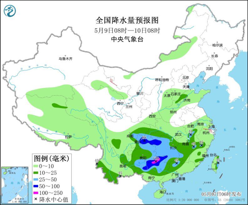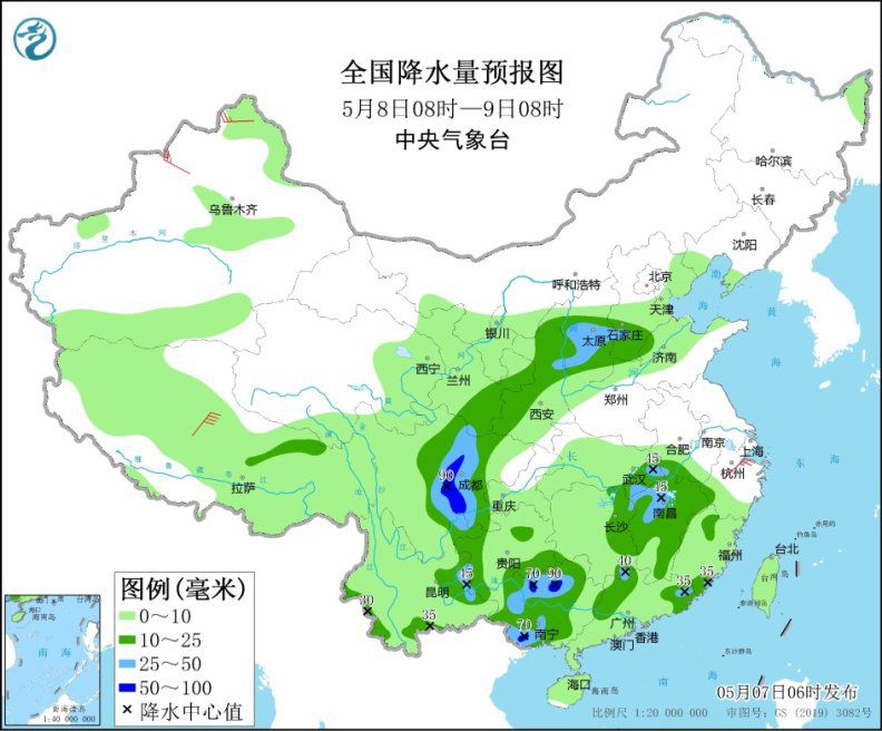 5月8日08時(shí)至9日08時(shí),甘肅南部、陜西北部和西南部、山西中部、河北南部、四川盆地西部、貴州西部和南部、云南東部和南部、湖北東南部、江西、湖南東部和南部、廣西、廣東北部、福建南部等地的部分地區(qū)有中到大雨,其中,四川盆地西部和南部、廣西北部和南部等地局地暴雨(50~90毫米)。新疆北部、江南東部、西藏中北部等地的部分地區(qū)有4~6級風(fēng)(見圖2)。