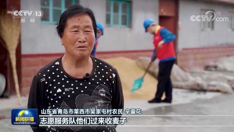 在山東萊西,66萬多畝小麥進入集中收獲期,當(dāng)?shù)?0多家社會化服務(wù)組織和志愿服務(wù)隊活躍在麥?zhǔn)找痪€。吳家屯村農(nóng)民辛喜花的孩子在外打工,在志愿服務(wù)隊幫助下,她家3畝多小麥不到一小時就收獲完成運送到家。