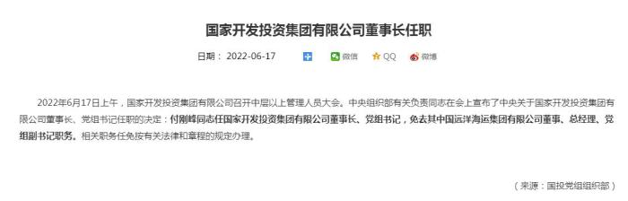 中新財經6月17日電 國家開發(fā)投資集團有限公司網站6月17日消息,2022年6月17日上午,國家開發(fā)投資集團有限公司召開中層以上管理人員大會。中央組織部有關負責同志在會上宣布了中央關于國家開發(fā)投資集團有限公司董事長、黨組書記任職的決定:付剛峰同志任國家開發(fā)投資集團有限公司董事長、黨組書記,免去其中國遠洋海運集團有限公司董事、總經理、黨組副書記職務。相關職務任免按有關法律和章程的規(guī)定辦理。(完)