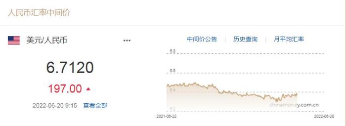 人民幣對(duì)美元中間價(jià)下調(diào)197個(gè)基點(diǎn) 1美元對(duì)人民幣6.7120元