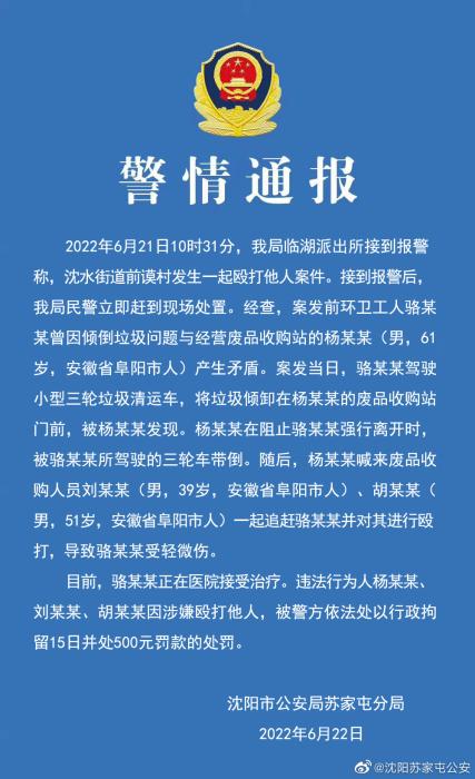 中新網(wǎng)6月23日電 據(jù)遼寧省沈陽市公安局蘇家屯分局官方微博消息,6月21日10時(shí)31分,該局臨湖派出所接到報(bào)警稱,沈水街道前謨村發(fā)生一起毆打他人案件。經(jīng)查,案發(fā)前環(huán)衛(wèi)工人駱某某曾因傾倒垃圾問題與經(jīng)營廢品收購站的楊某某(男,61歲,安徽省阜陽市人)產(chǎn)生矛盾。
