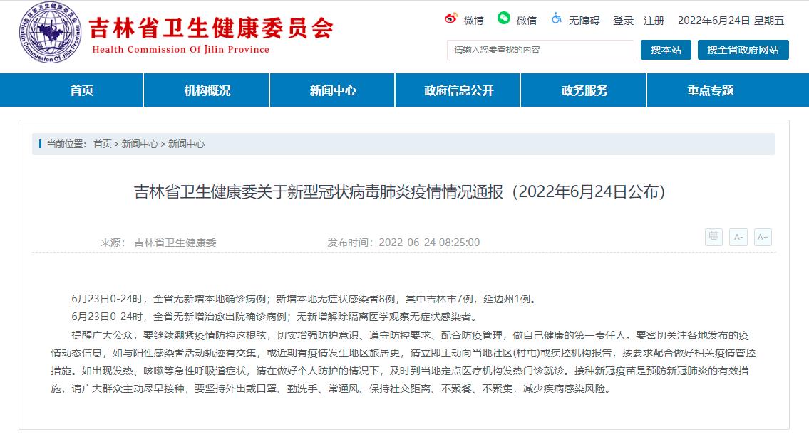 中新網(wǎng)6月24日電 據(jù)吉林省衛(wèi)健委網(wǎng)站消息,6月23日0-24時,全省無新增本地確診病例;新增本地?zé)o癥狀感染者8例,其中吉林市7例,延邊州1例。