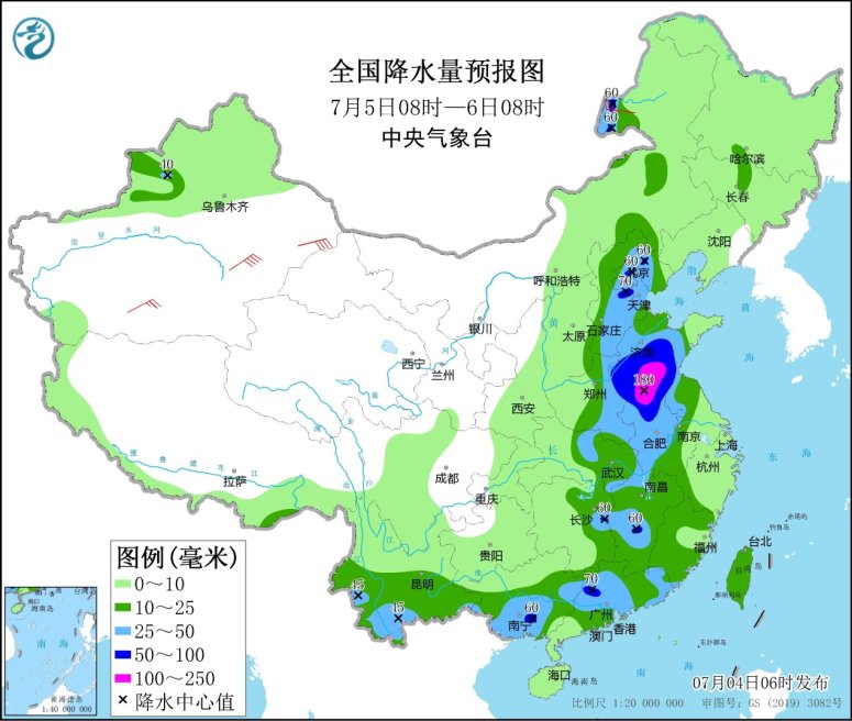 7月5日08時(shí)至6日08時(shí),內(nèi)蒙古中東部、京津冀、黃淮中東部、西南地區(qū)南部、江淮大部、江漢東部、江南中東部、華南大部、臺(tái)灣島等地的部分地區(qū)有中到大雨,其中,山東中南部、河南東部、安徽北部、江蘇北部、京津冀、廣東北部等地的部分地區(qū)有暴雨,山東南部、安徽北部、江蘇北部、河南東部等地局地大暴雨(100~180毫米)。新疆北部和東部、內(nèi)蒙古西部、甘肅西部、東北地區(qū)南部、山東半島、江南東部等地的部分地區(qū)有4~6級(jí)風(fēng),其中,新疆東部、浙江東部等地的部分地區(qū)風(fēng)力可達(dá)7級(jí)以上;東海大部海域、臺(tái)灣海峽、北部灣有5~6級(jí)、陣風(fēng)7級(jí)的偏南到西南風(fēng)。