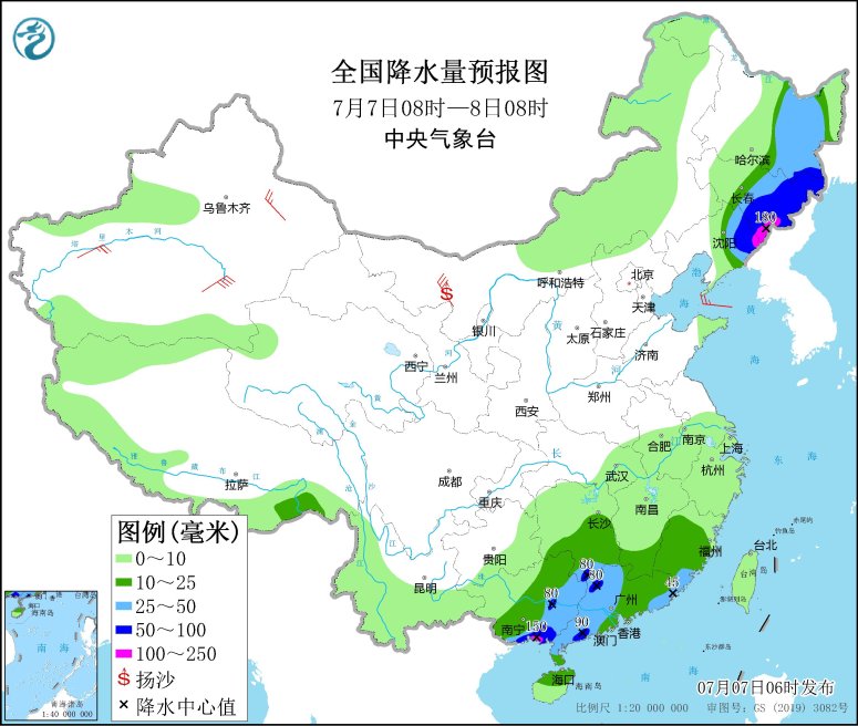 預(yù)計(jì),7月7日08時(shí)至8日08時(shí),遼寧東部、吉林中東部、黑龍江東部、廣西中東部、廣東西部和東南部等地有大到暴雨,其中,吉林東南部、廣西東南部等地的部分地區(qū)有大暴雨(100~180毫米)。上述部分地區(qū)伴有短時(shí)強(qiáng)降水(最大小時(shí)降雨量20~50毫米,局地可超過60毫米),局地有雷暴大風(fēng)等強(qiáng)對流天氣。中央氣象臺7月7日06時(shí)發(fā)布暴雨藍(lán)色預(yù)警。